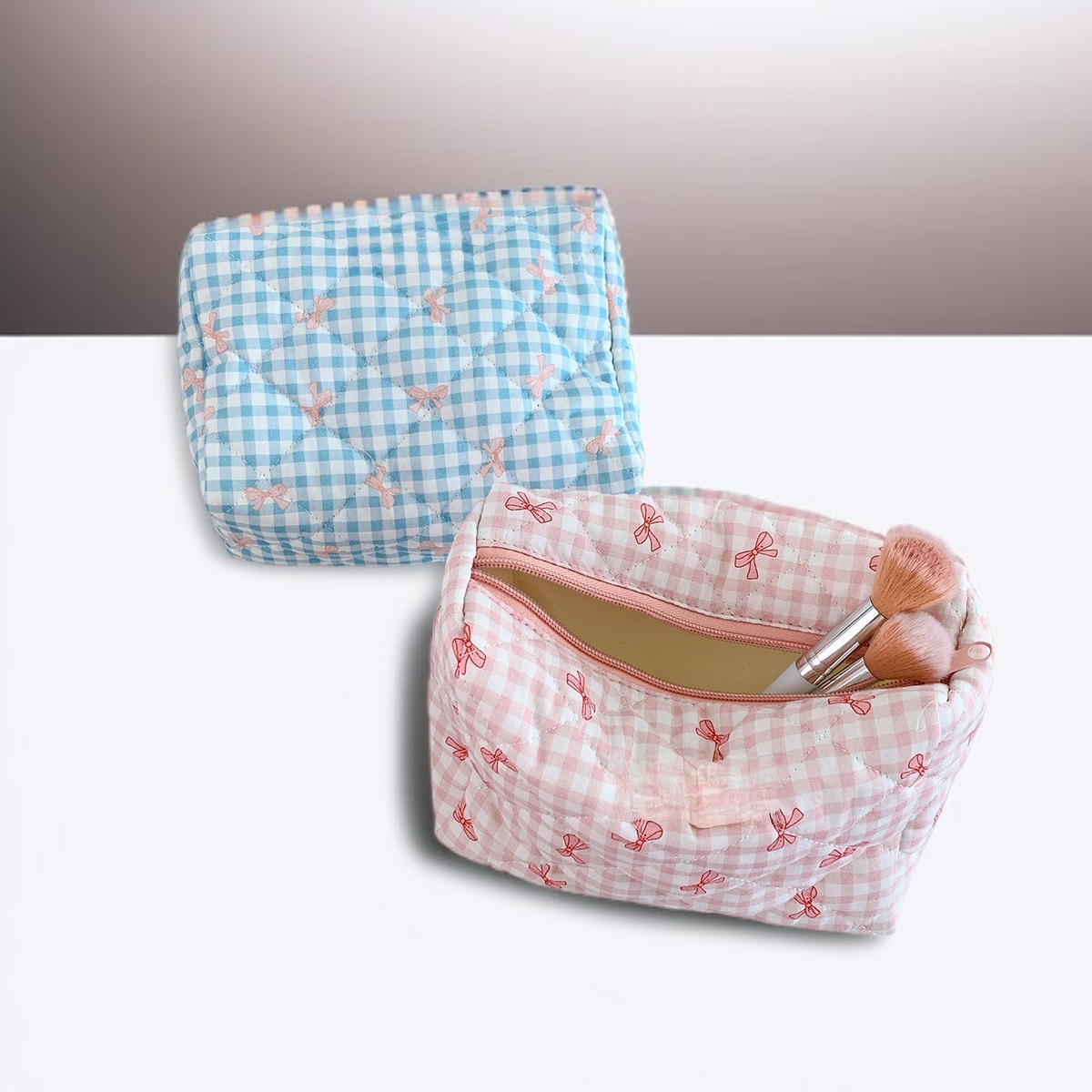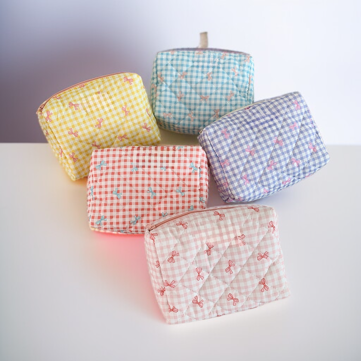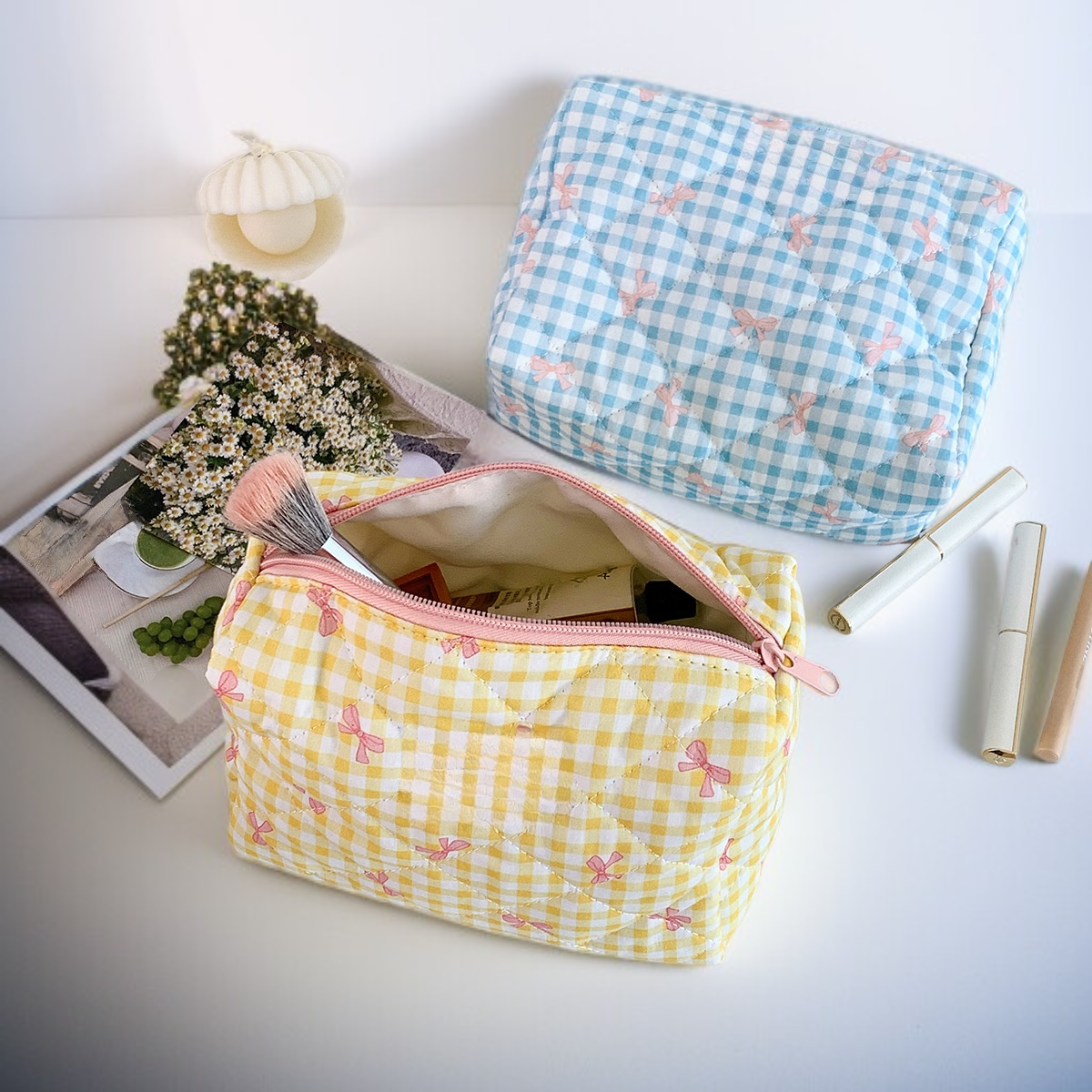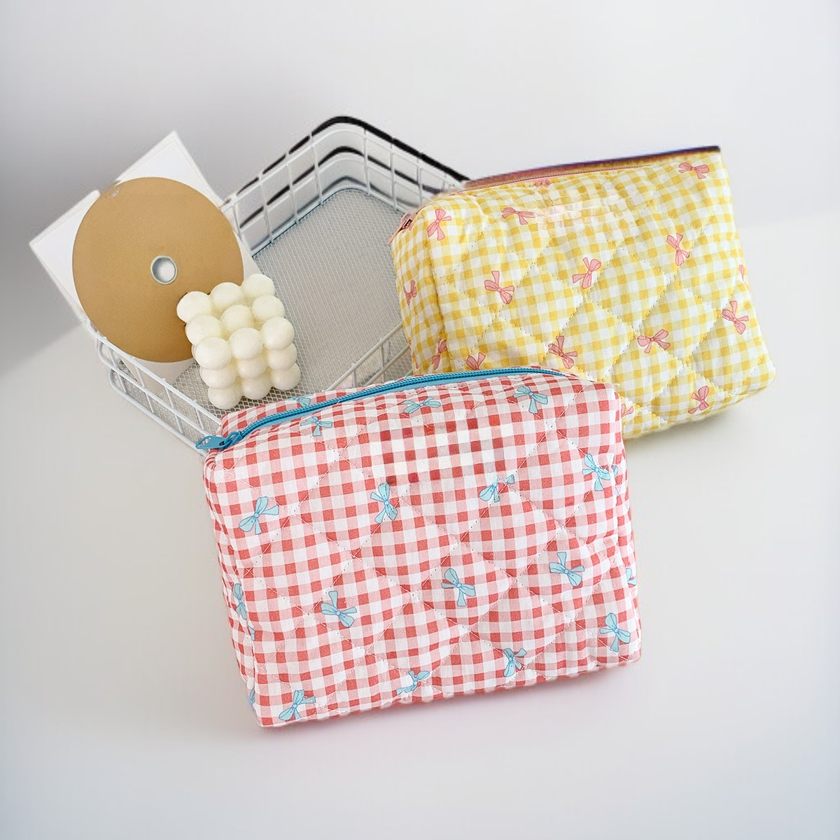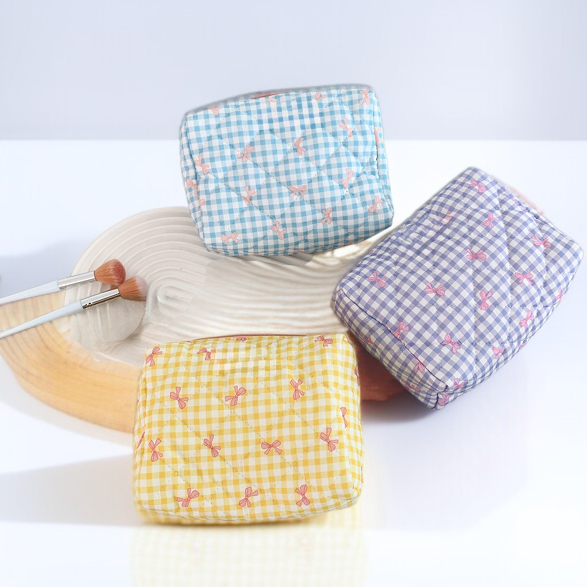 Large capacity cosmetic bag with plaid bow, portable toiletry bag